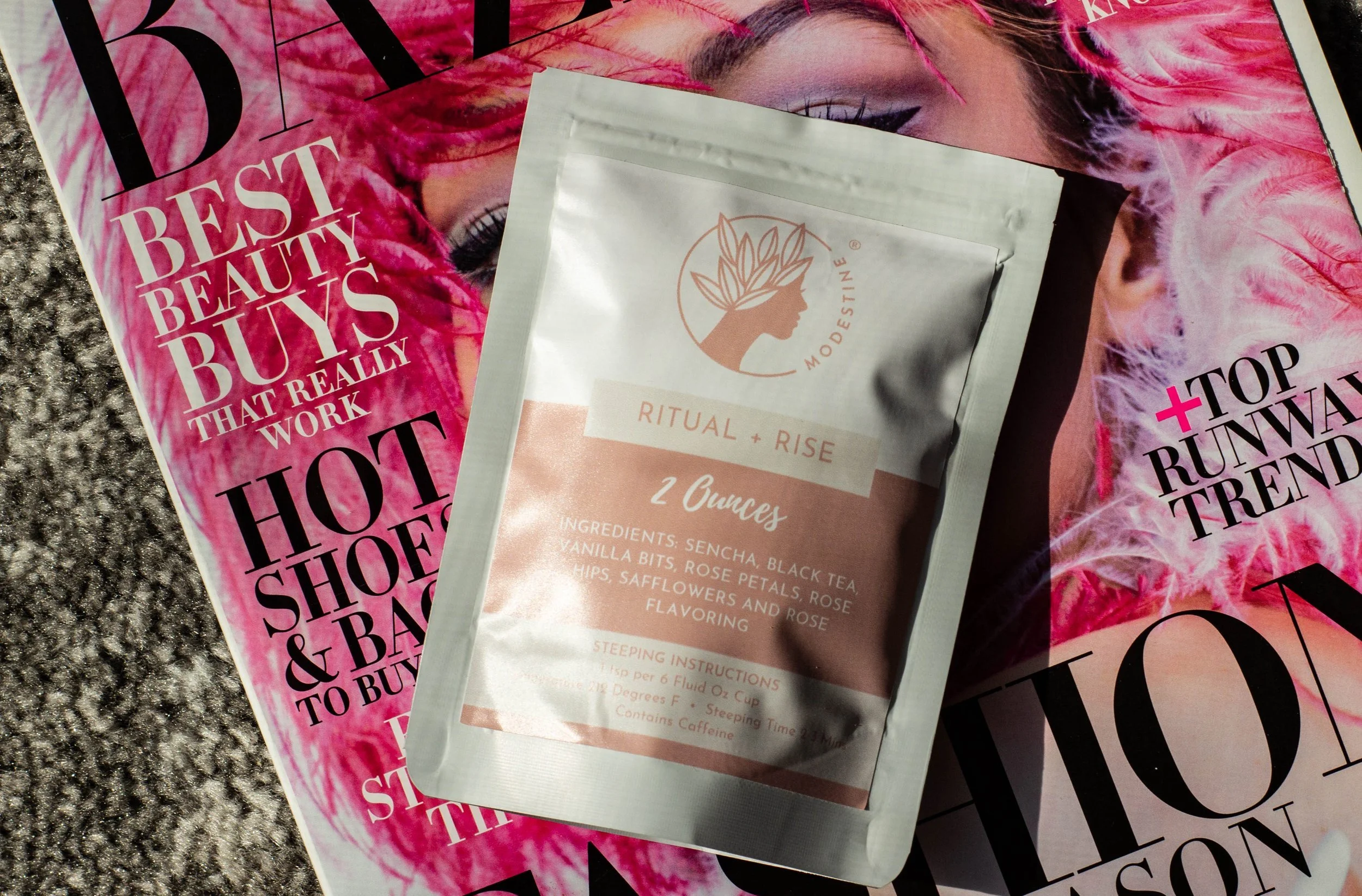Laura creates a mini tea ceremony, following her grandmother, Modestine’s tradition. Her favorite morning tea lately has been Ritual + Rise.
